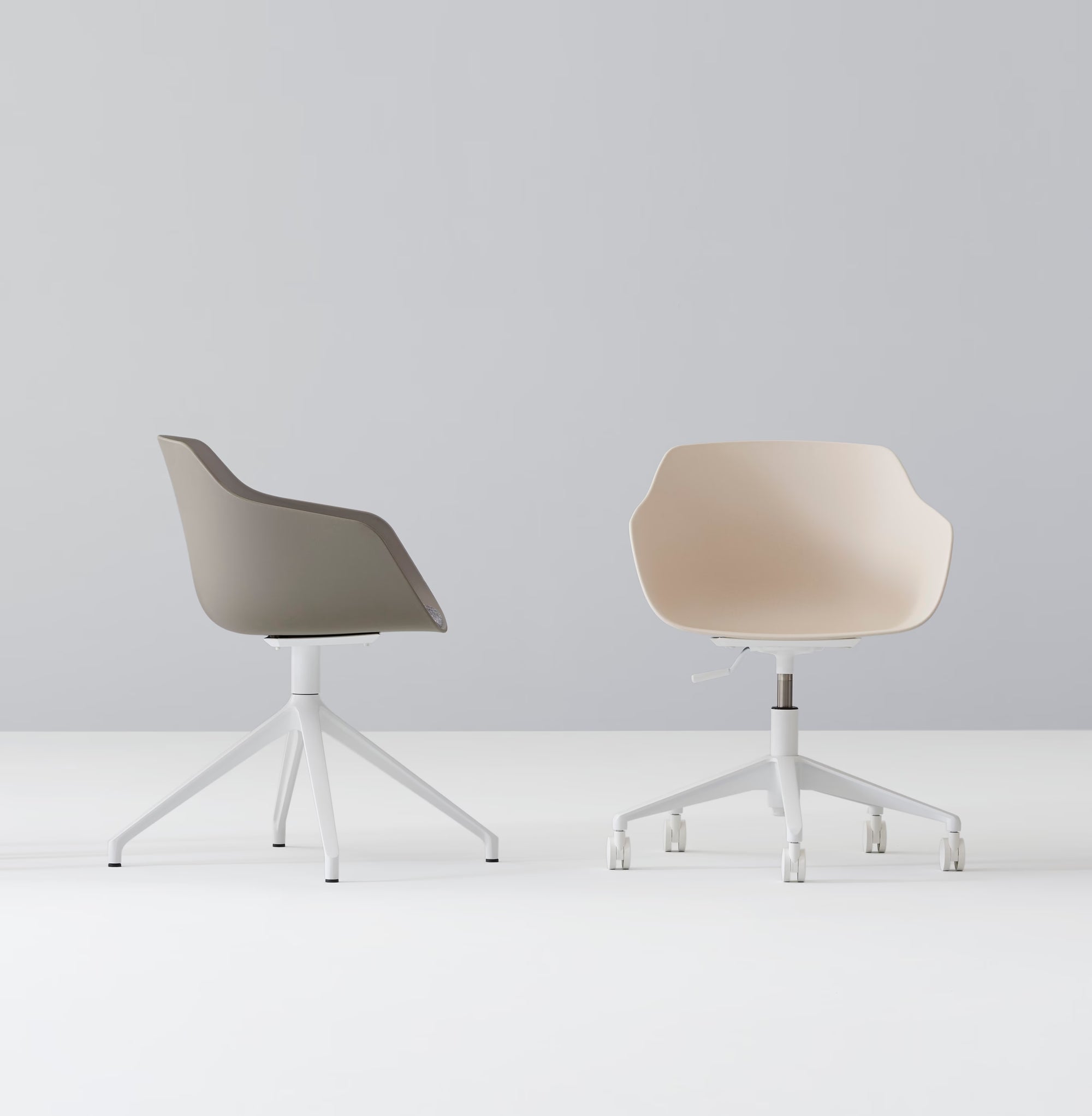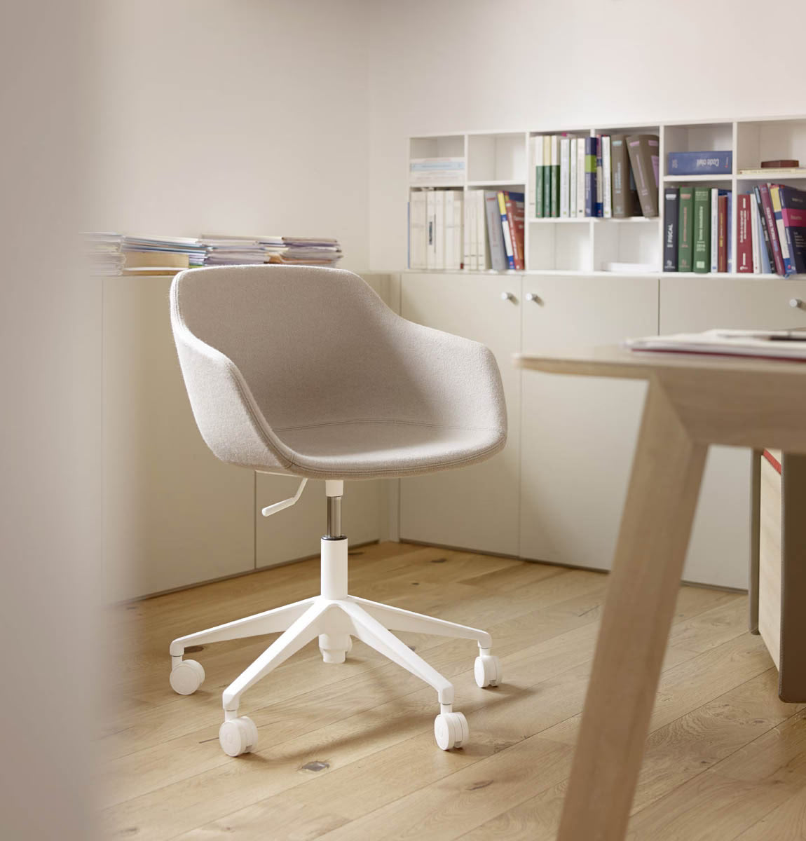 Deux bases répondent aux usages. La version à roulettes adopte un piètement étoile 5 branches avec pivot et vérin : la hauteur d’assise s’ajuste simplement (env. 380–500 mm) et les micro-déplacements au poste se font sans effort. La version piètement fixe repose sur 4 branches métalliques, avec assise giratoire : la chaise reste en place en réunion tout en permettant de se tourner vers l’écran, la table ou un interlocuteur, sans déplacements parasites. Dans chaque configuration, l’entretien est simple (microfibre) et la fabrication est européenne.