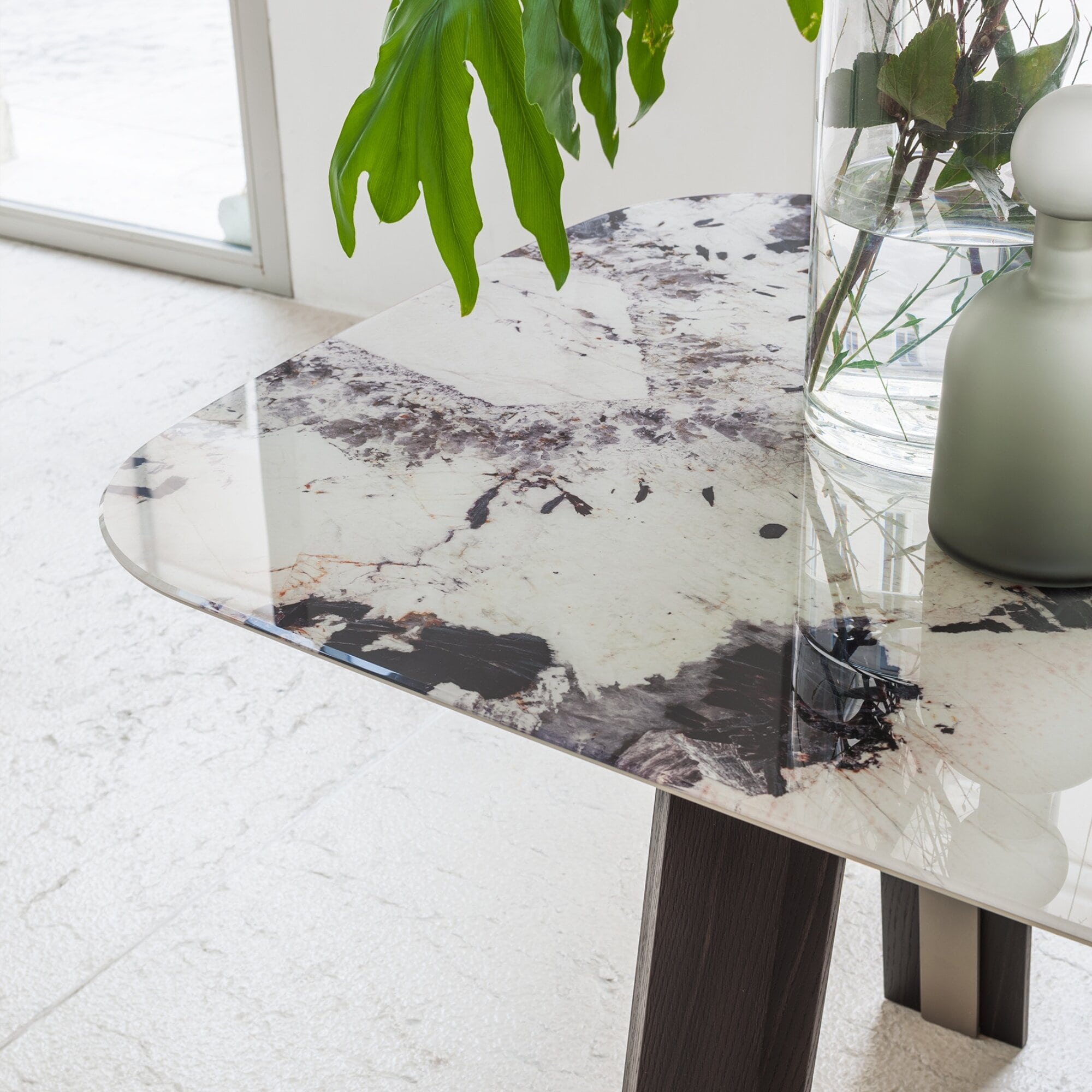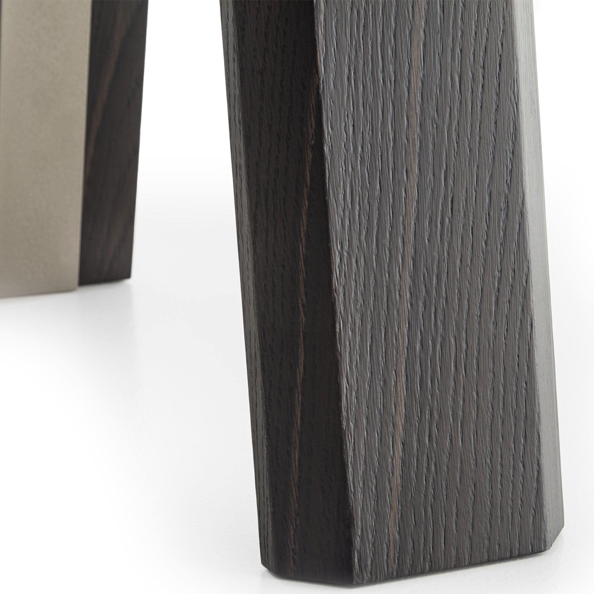 The Bridge table by Morica Design is a piece that captures attention at first glance. Designed to be the center of your shared moments, it combines the authenticity of Canaletto walnut or Laguna oak , shaped and edged by hand, with a subtle touch of modernity thanks to the metal inserts . The top, with its elegant 60° inclination, captures the light and envelops your space in natural warmth. The walnut-veneered MDF legs , adorned with dark brown or champagne metal details, give Bridge a unique balance between tradition and innovation. Whether for a family meal or a business meeting , the Bridge table embodies refined conviviality with a touch of inimitable character.