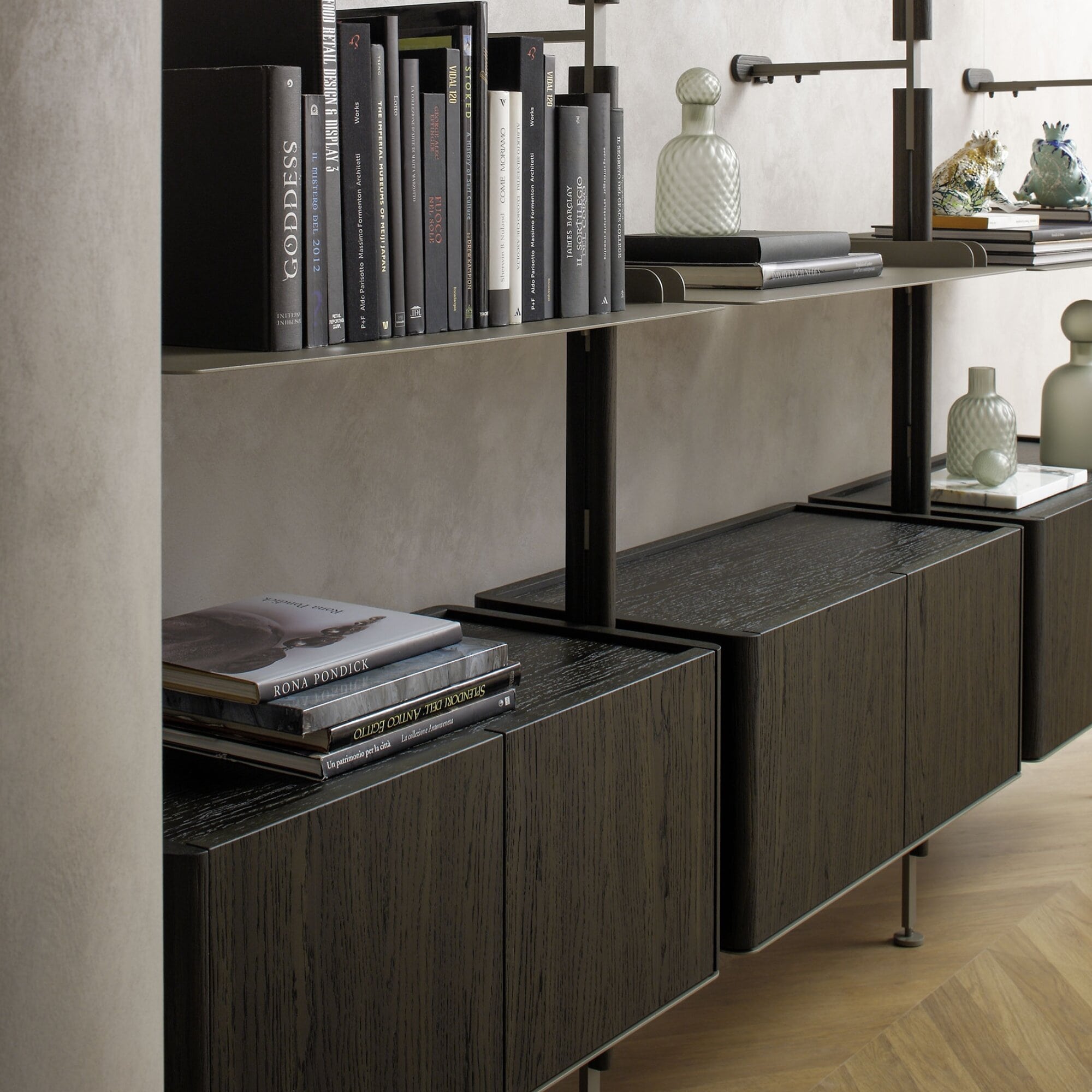 The library Galaxy stands out for its innovative modular system that allows great flexibility to create unique compositions, suitable for any living or working space. Each module combines solid wood uprights with lacquered metal shelves and veneered MDF storage elements . The structure in natural or dark oak, combined with the champagne metal finishes, offers a contrast between the warmth of wood and the modernity of metal. Galaxy is designed to evolve with your interior, offering endless customization options to meet everyone's tastes and needs. The clean aesthetics of its lines and the attention paid to the quality of the materials make this bookcase a functional element while adding a touch of sophistication.