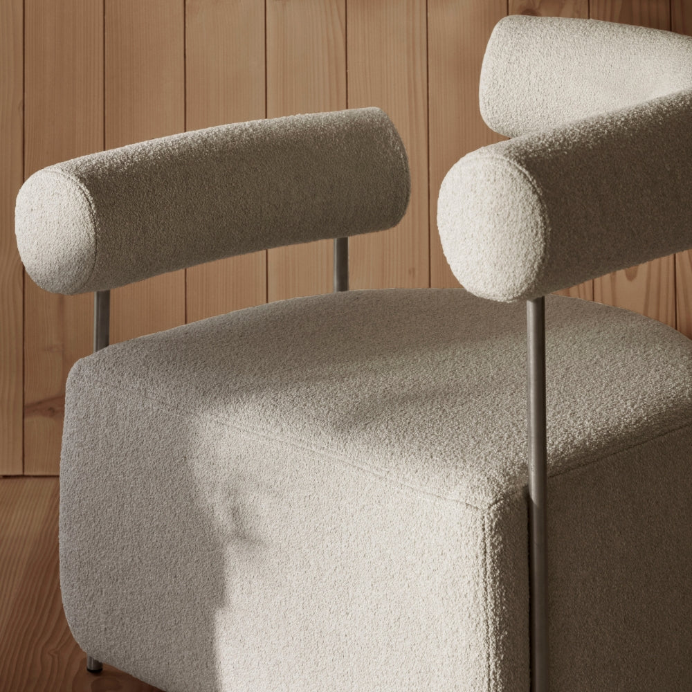 The Solitude Lounge Chair in Beige offers a serene and elegant addition to any space. Embodying the philosophy of “sculptural minimalism,” this chair draws inspiration from the geometric principles of the Bauhaus movement. The unique design features offset armrests for versatile and comfortable seating options. Crafted with luxurious, coarsely woven Italian bouclé fabric in a warm beige hue, the chair’s fabric complements its stainless steel frame, creating a harmonious contrast. More than just a seating option, the minimalist Solitude Chair is a true statement piece, fusing art and design to enhance both the aesthetic and comfort of your living space.