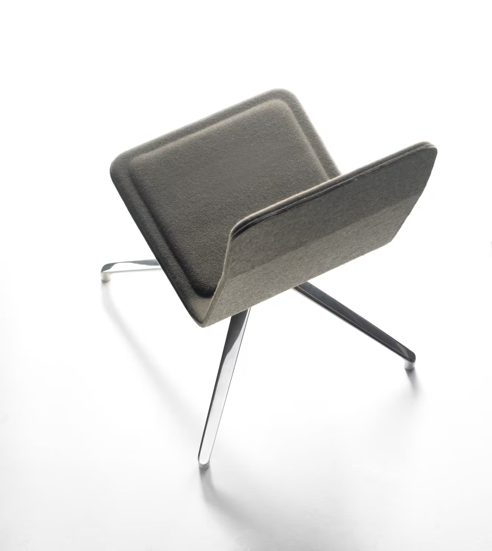 Coque bois tapissée côté assise, dos feutre chaleureux : rendu sérieux sans froideur, lecture homogène du poste à la salle de réunion.