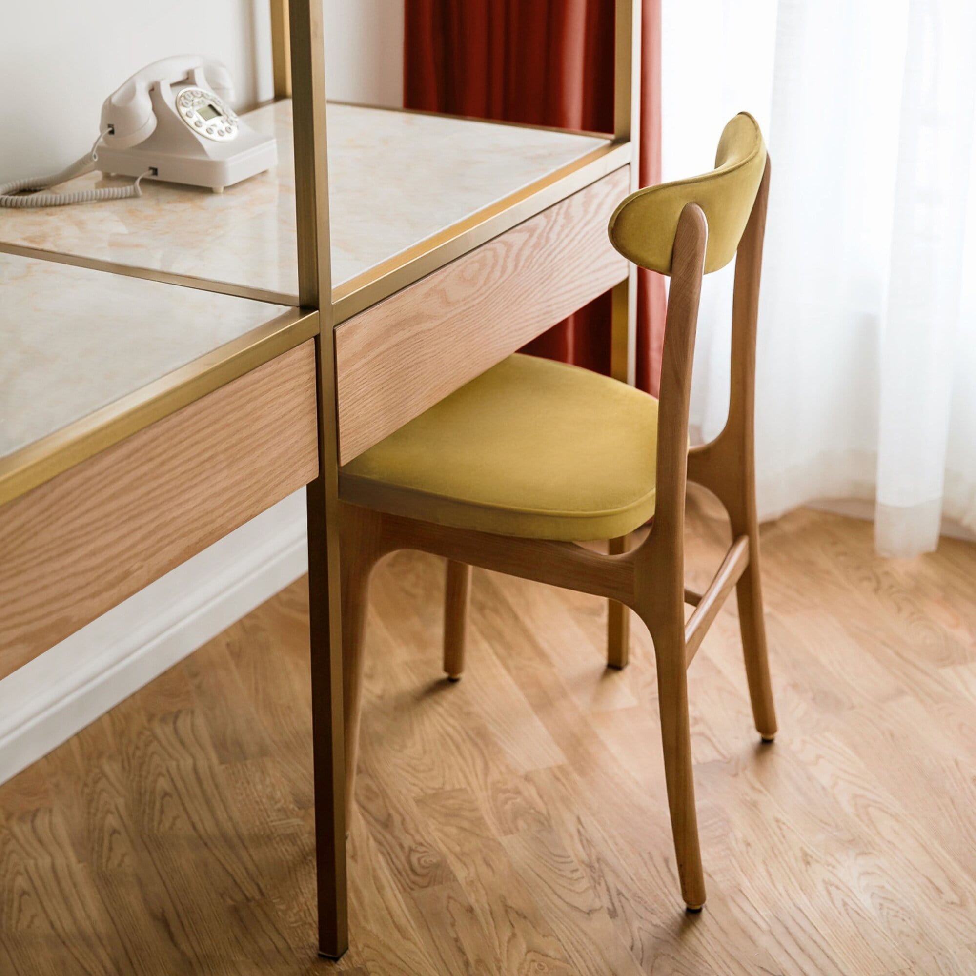 Fabriquée en frêne massif, elle offre une robustesse adaptée aux usages intensifs, que ce soit dans une salle à manger familiale ou un restaurant élégant. Son assise et son dossier rembourrés, disponibles en tissu bouclé, velours ou coco, procurent un confort optimal tout en ajoutant une touche tactile chaleureuse.