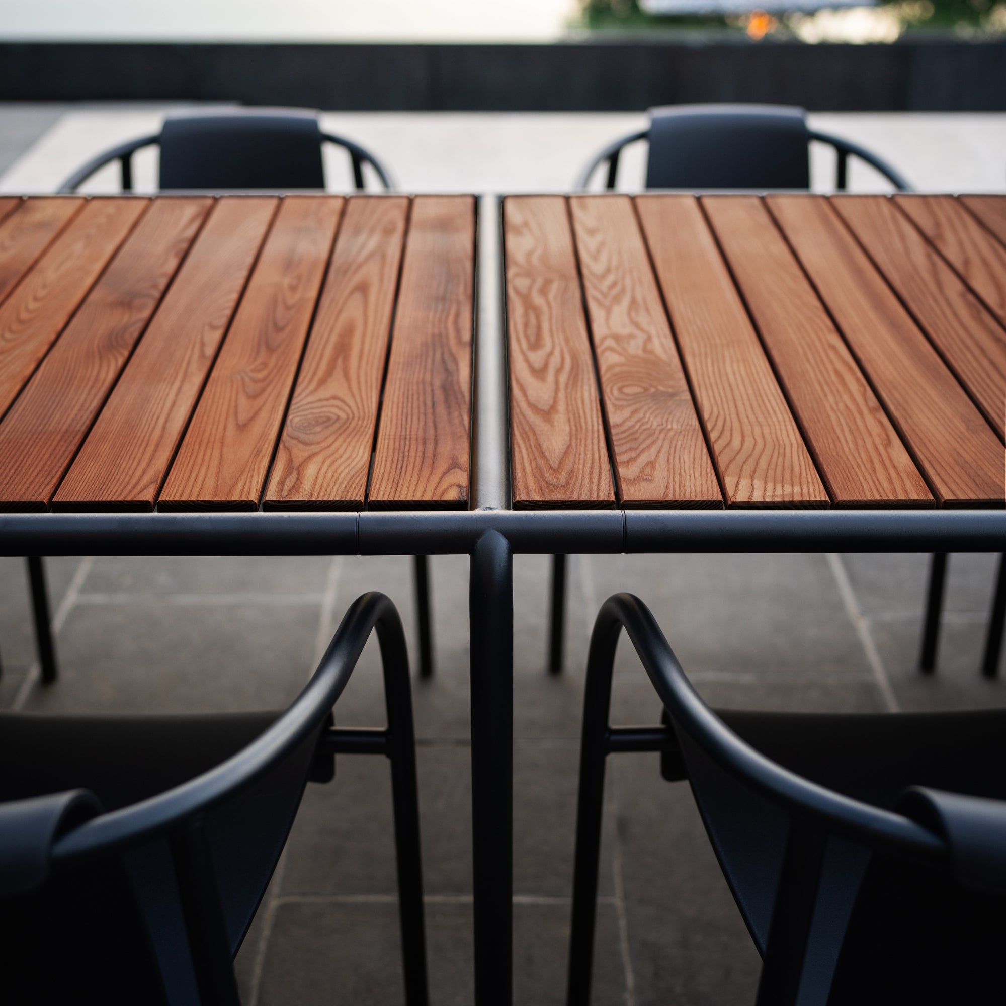 Les tables de repas extérieures Avanti de Houe, conçues par Henrik Pedersen, se distinguent par un design minimaliste et modulaire. Disponibles en plusieurs tailles, elles répondent aux besoins variés des petits repas intimes aux grandes réceptions. Les plateaux sont en frêne thermo-traité ou en pin certifié FSC®, assurant une robustesse exceptionnelle et une esthétique naturelle. Les pieds angulaires en acier noir thermolaqué offrent une stabilité optimale et maximisent l’utilisation de la surface du plateau. La modularité permet d'ajouter des extensions, offrant une flexibilité d’utilisation pour toutes les configurations.