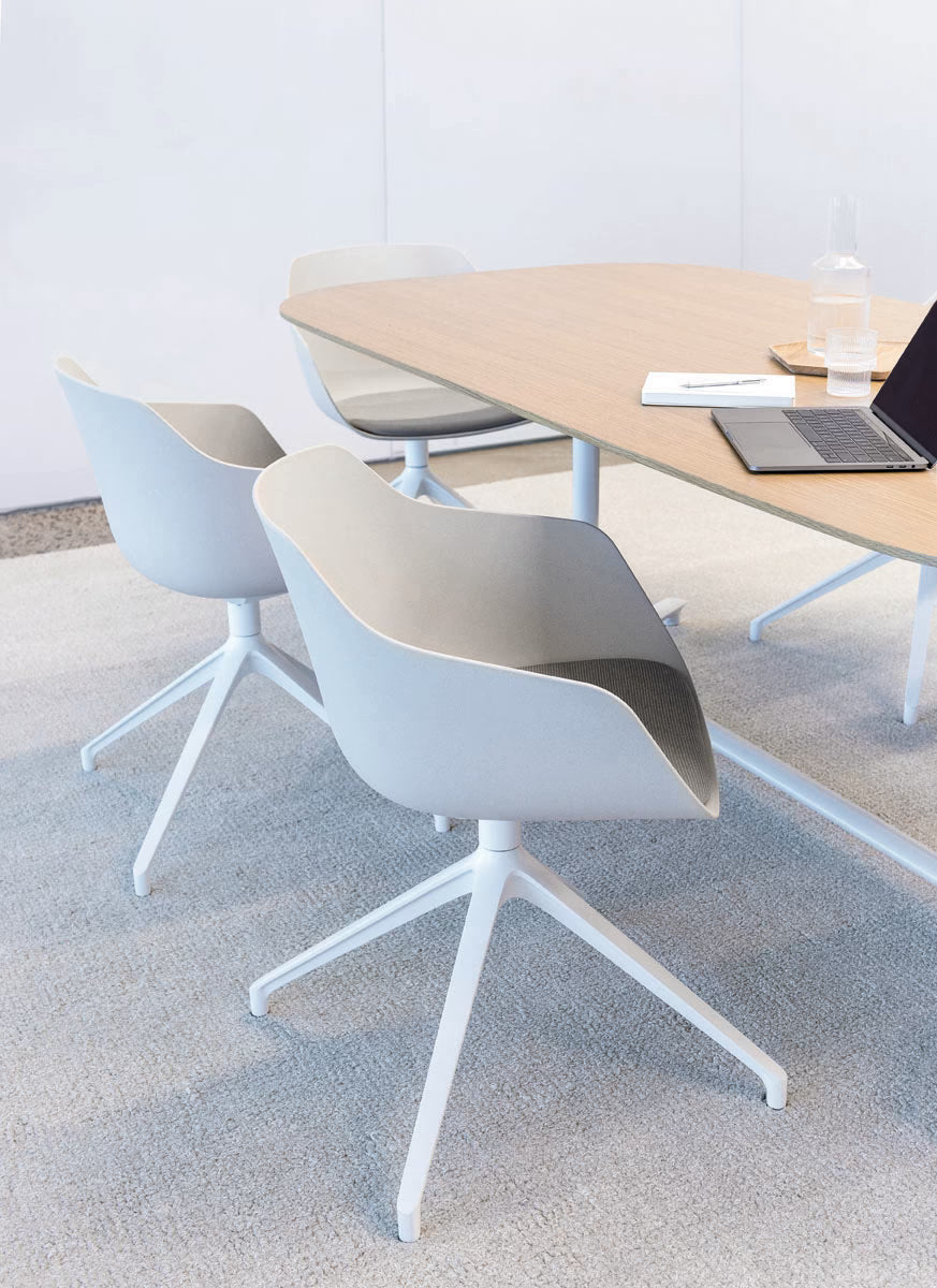 Deux bases répondent aux usages. La version à roulettes adopte un piètement étoile 5 branches avec pivot et vérin : la hauteur d’assise s’ajuste simplement (env. 380–500 mm) et les micro-déplacements au poste se font sans effort. La version piètement fixe repose sur 4 branches métalliques, avec assise giratoire : la chaise reste en place en réunion tout en permettant de se tourner vers l’écran, la table ou un interlocuteur, sans déplacements parasites. Dans chaque configuration, l’entretien est simple (microfibre) et la fabrication est européenne.