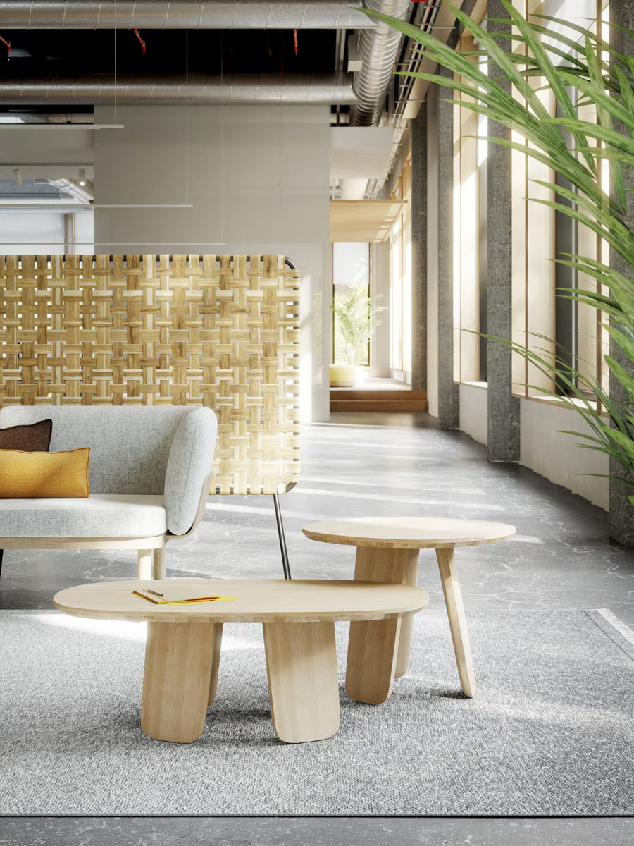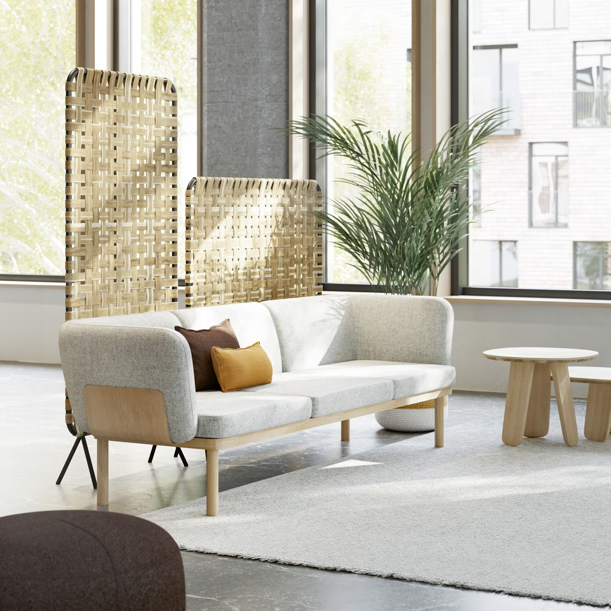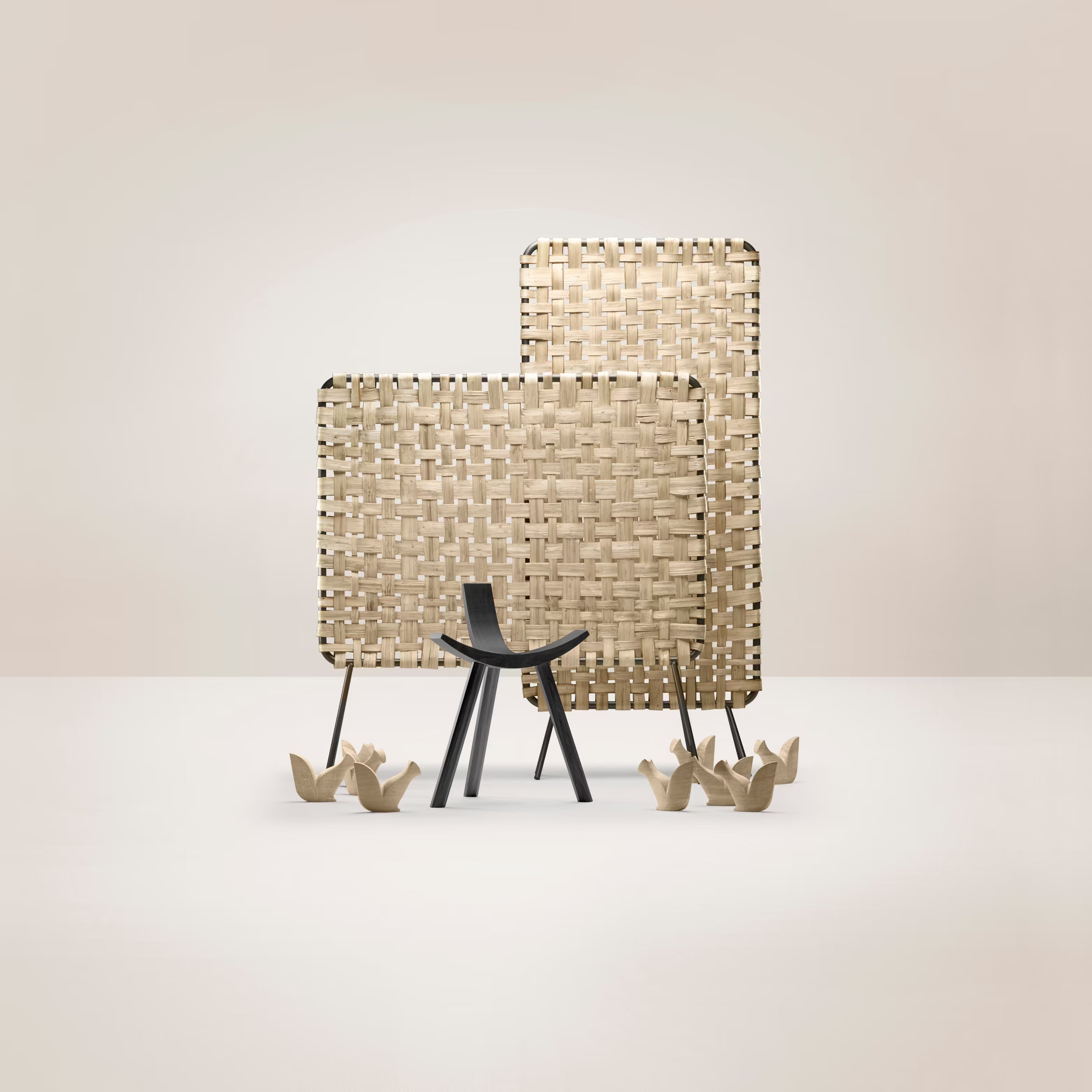 Zumitz Dividers est une séparation en bois destinée à structurer un plateau sans cloison fixe. Modules en châtaignier tressé à la main sur structure métallique discrète, posés en vertical ou horizontal selon le contexte. Le maillage filtre les vues et préserve la lumière : séparateur de bureau entre postes, matérialisation d’un passage, paravent bureau ponctuel. Usage intérieur, finition naturelle.