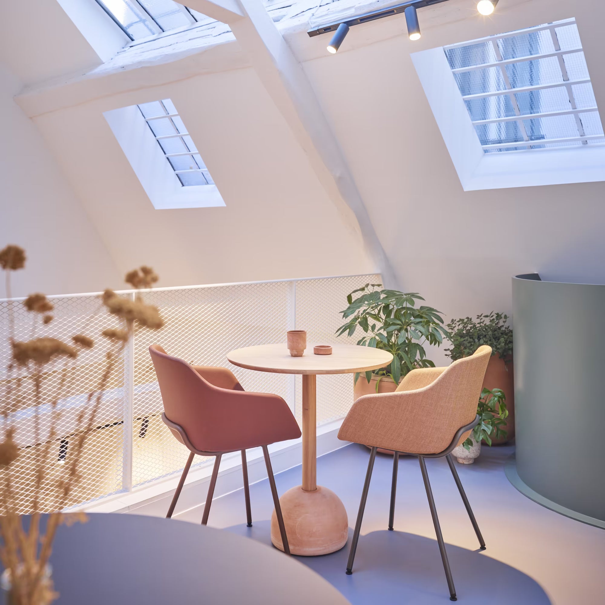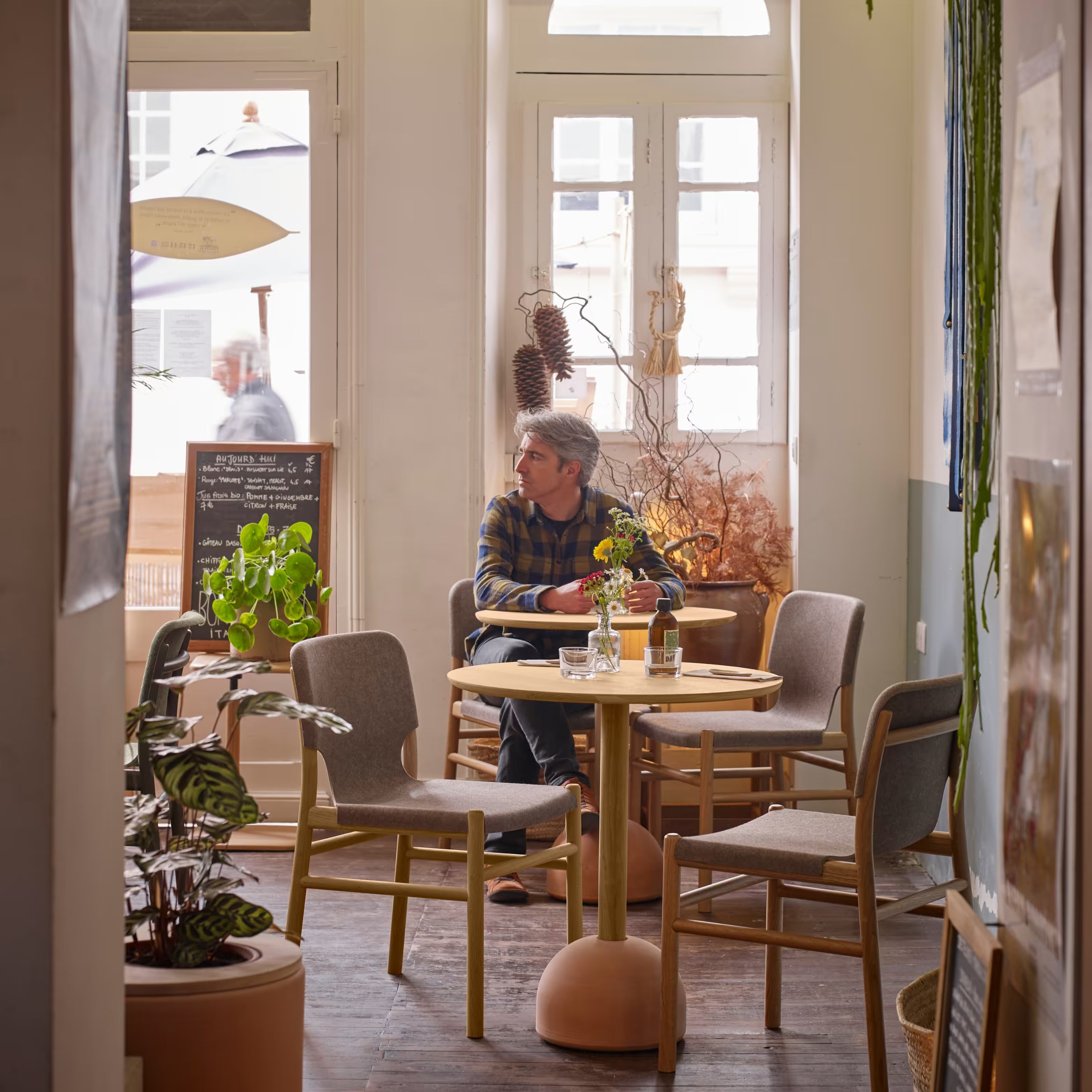 Deux niveaux selon l’usage : H90 cm pour tabourets ~65 cm et service comptoir ; H108 cm pour échanges debout et tabourets ~75–80 cm. Le format bistrot rond facilite la conversation et libère la circulation tout autour ; implantation simple en ligne, en îlot ou près d’un passage sans gêner le flux.