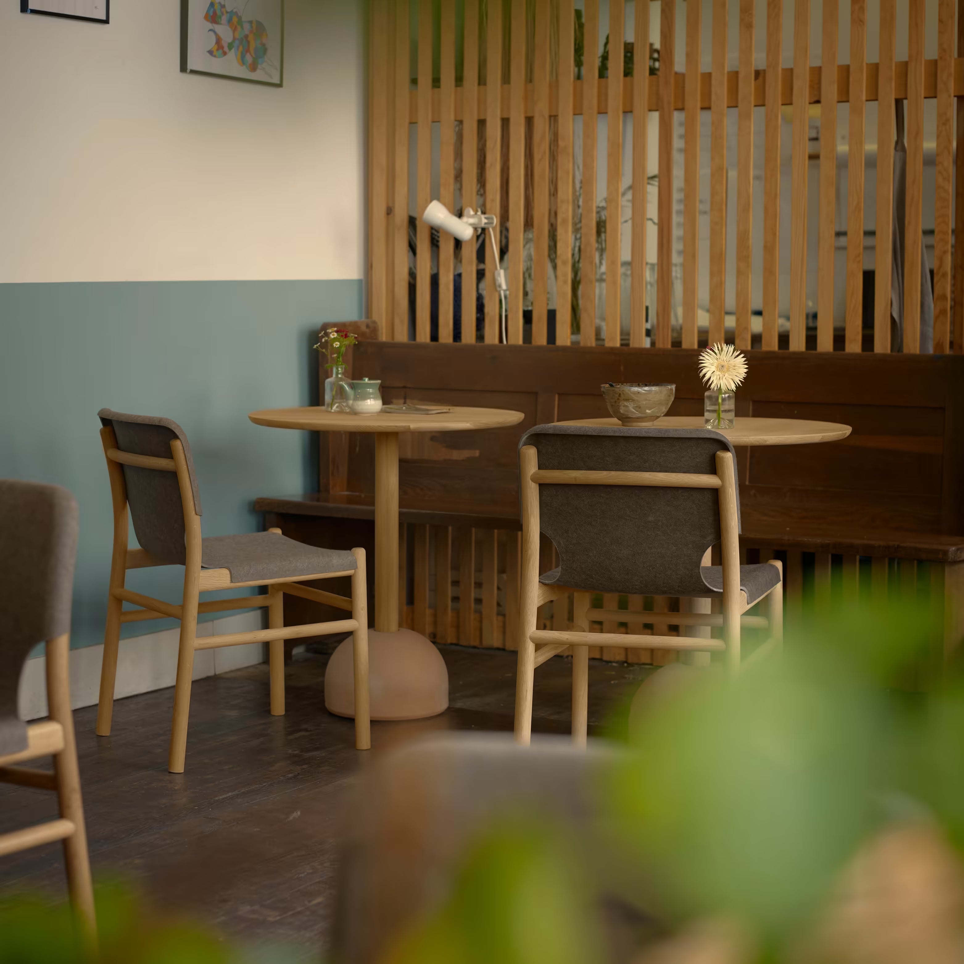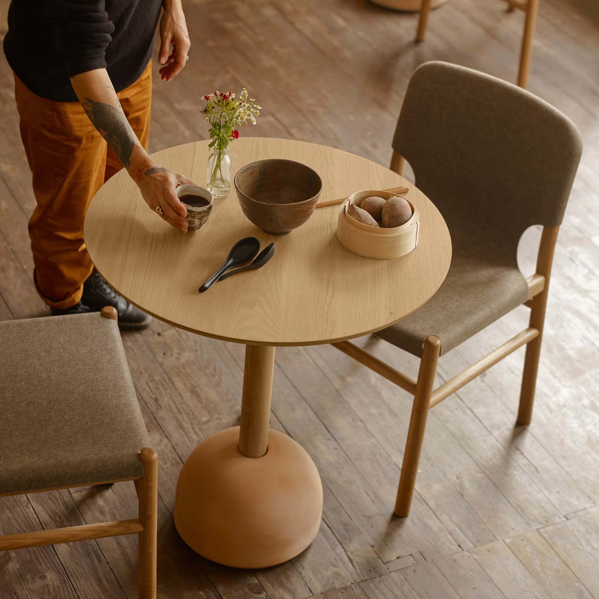 Pied central en chêne avec fourreau bois et cache-pied en terre cuite ; plateau épaisseur 22 mm au choix en chêne (présence bois, chants massifs) ou en stratifié Fenix sur support CP avec alaises en chêne (entretien intensif). L’ensemble garde un plan lisible et une base protégée dans les zones d’impact, tout en restant sobre.