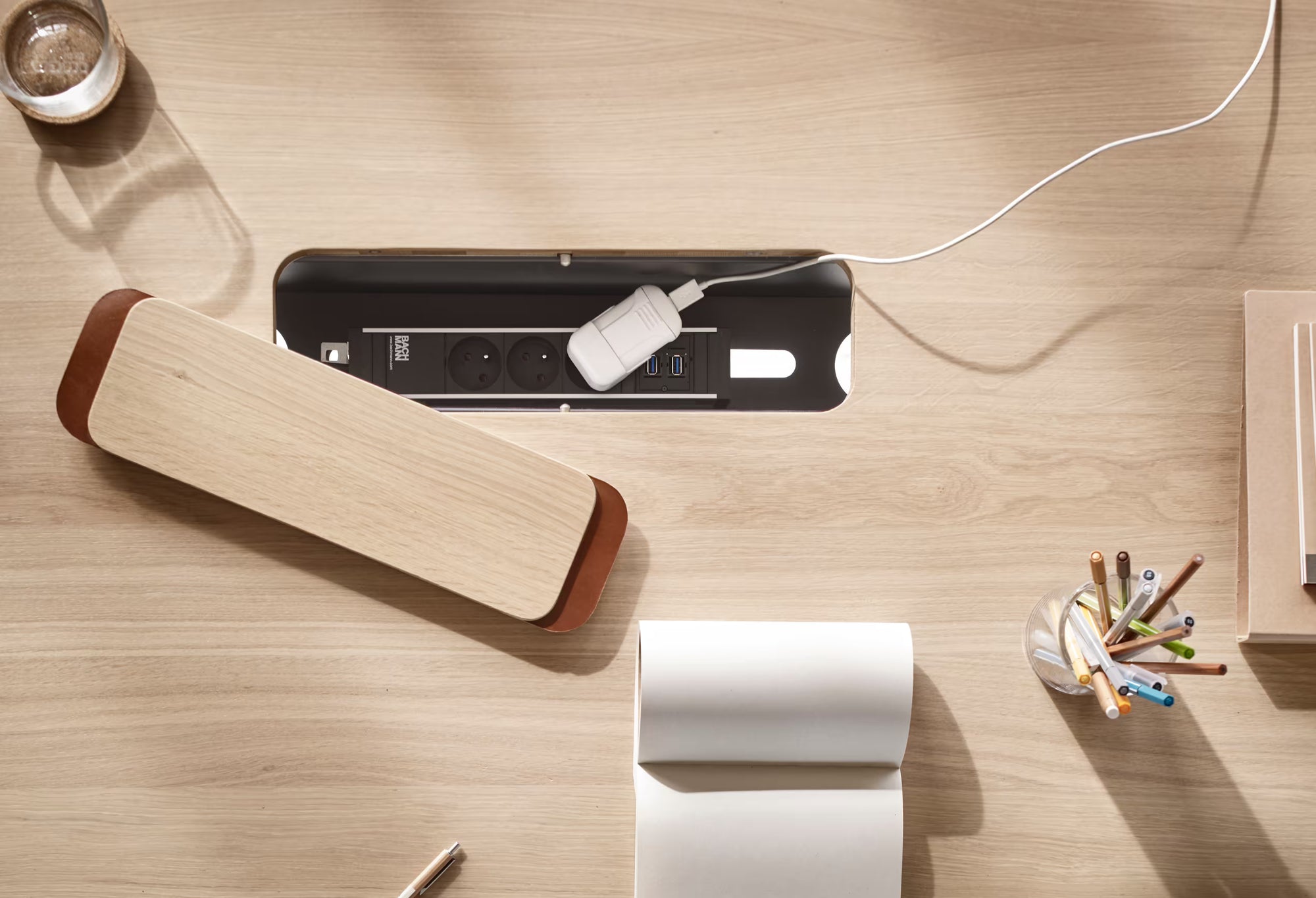 Goulotte métallique continue avec trappes d’accès ; sortie de câbles par brosse et caches bois/cuir pour garder le plan net.