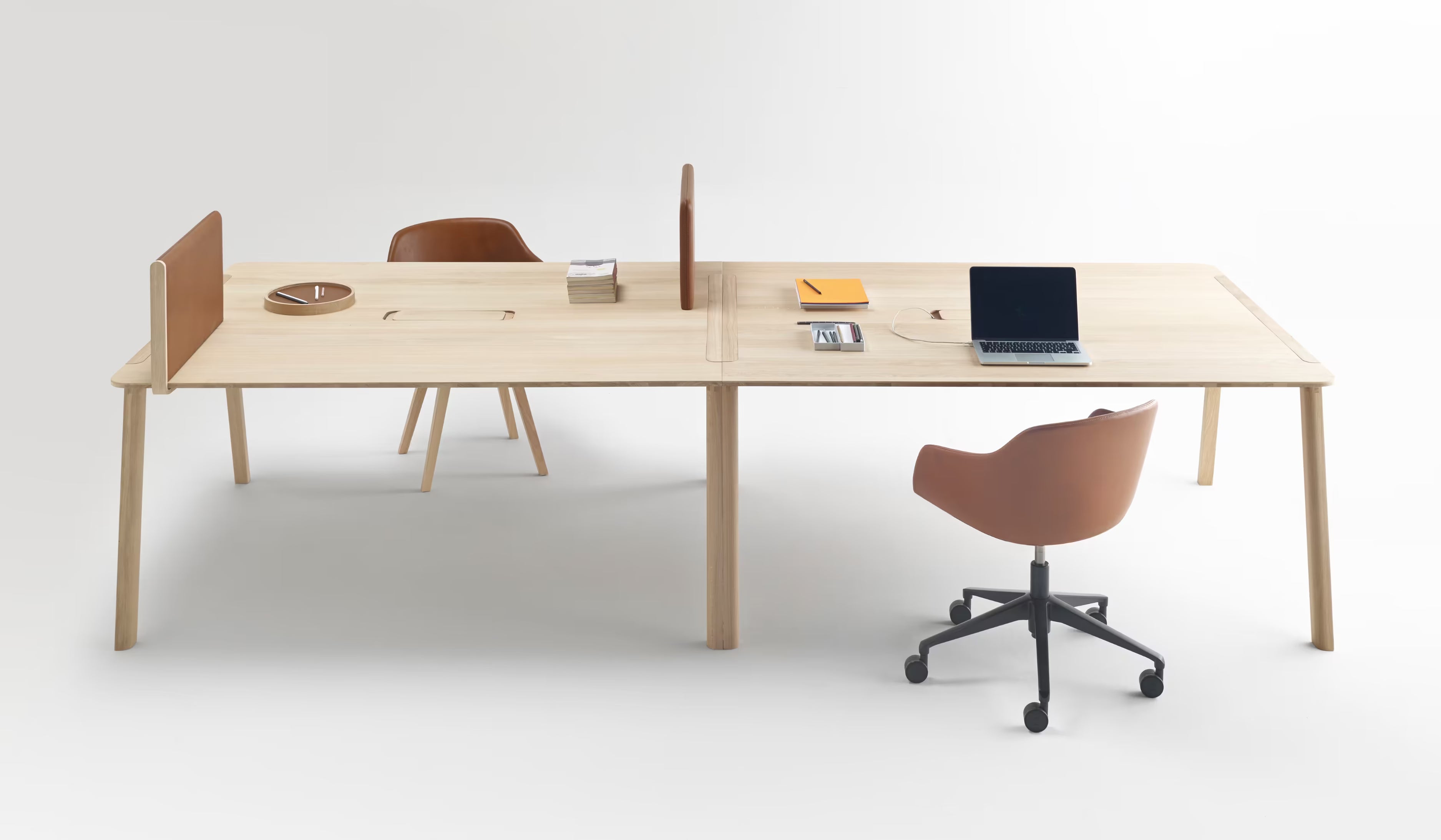 Heldu installe un plan de travail commun clair et accueillant, pensé pour les équipes qui alternent focus et échanges rapides. Plateau bois chaleureux, structure stable, circulation fluide tout autour : la table se fond dans un open space, une salle projet ou un pôle dédié sans alourdir l’espace.