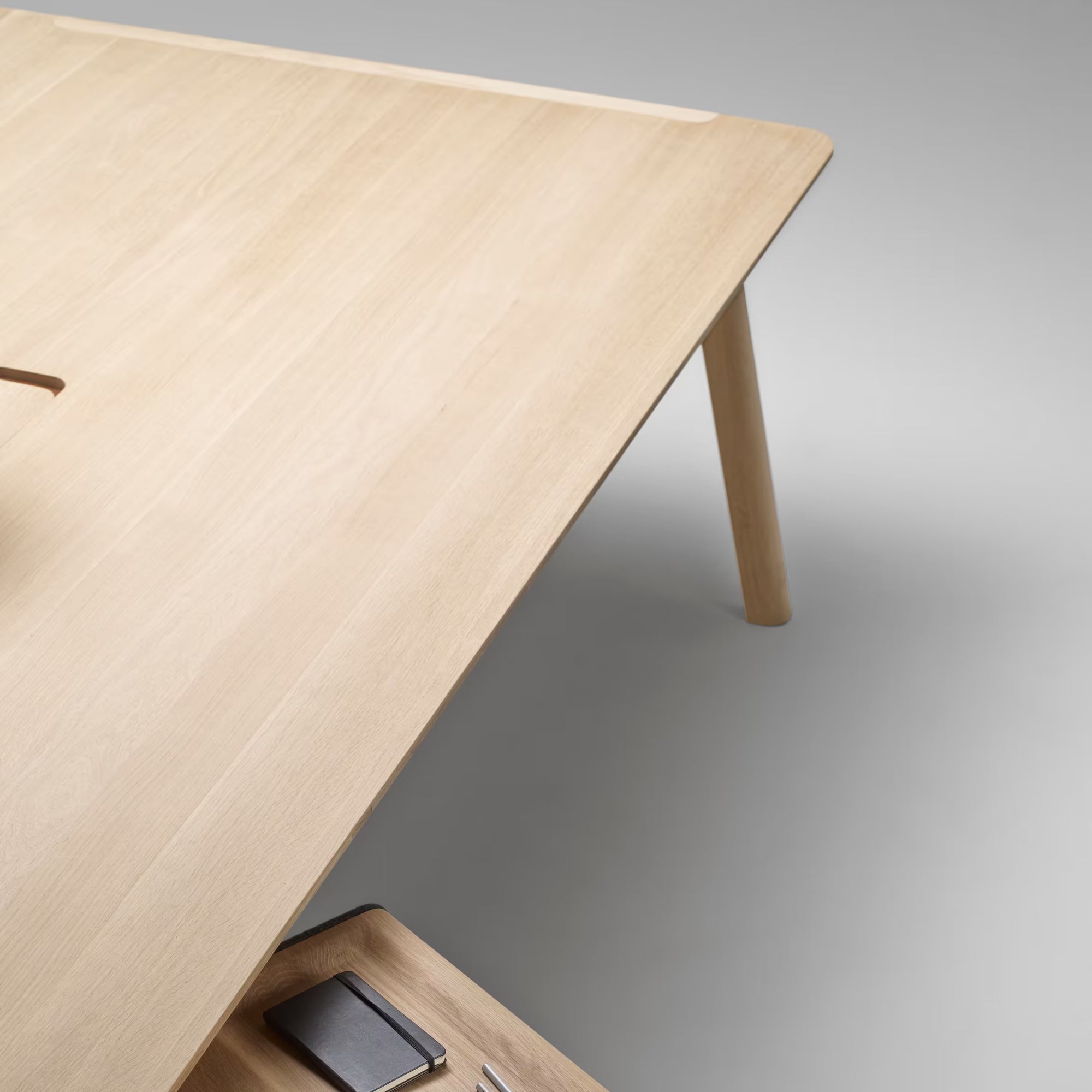 Piétement en chêne massif, plateau ép. 22 mm sur support tri-plis chêne : stabilité et tenue au quotidien.