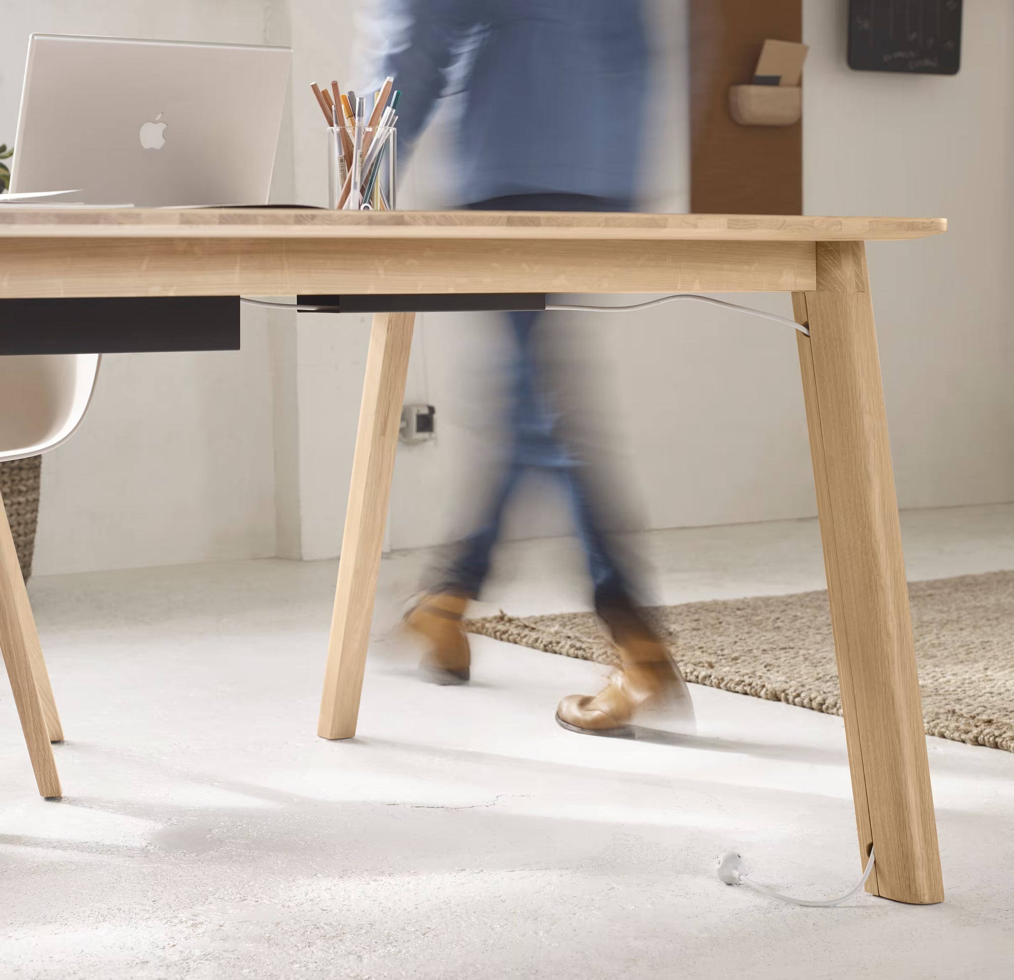Piétement en chêne massif, plateau ép. 22 mm sur support tri-plis chêne : stabilité et tenue au quotidien.