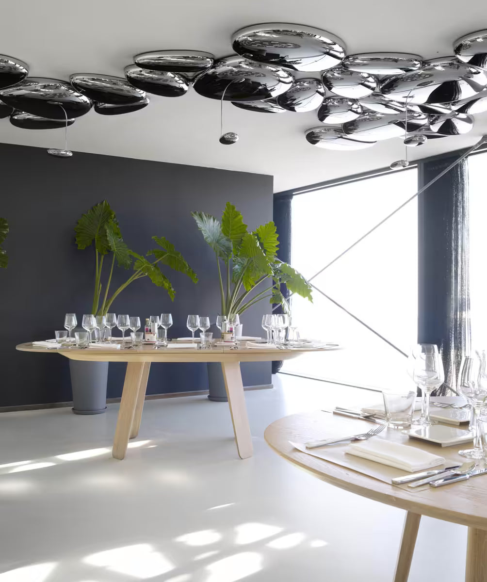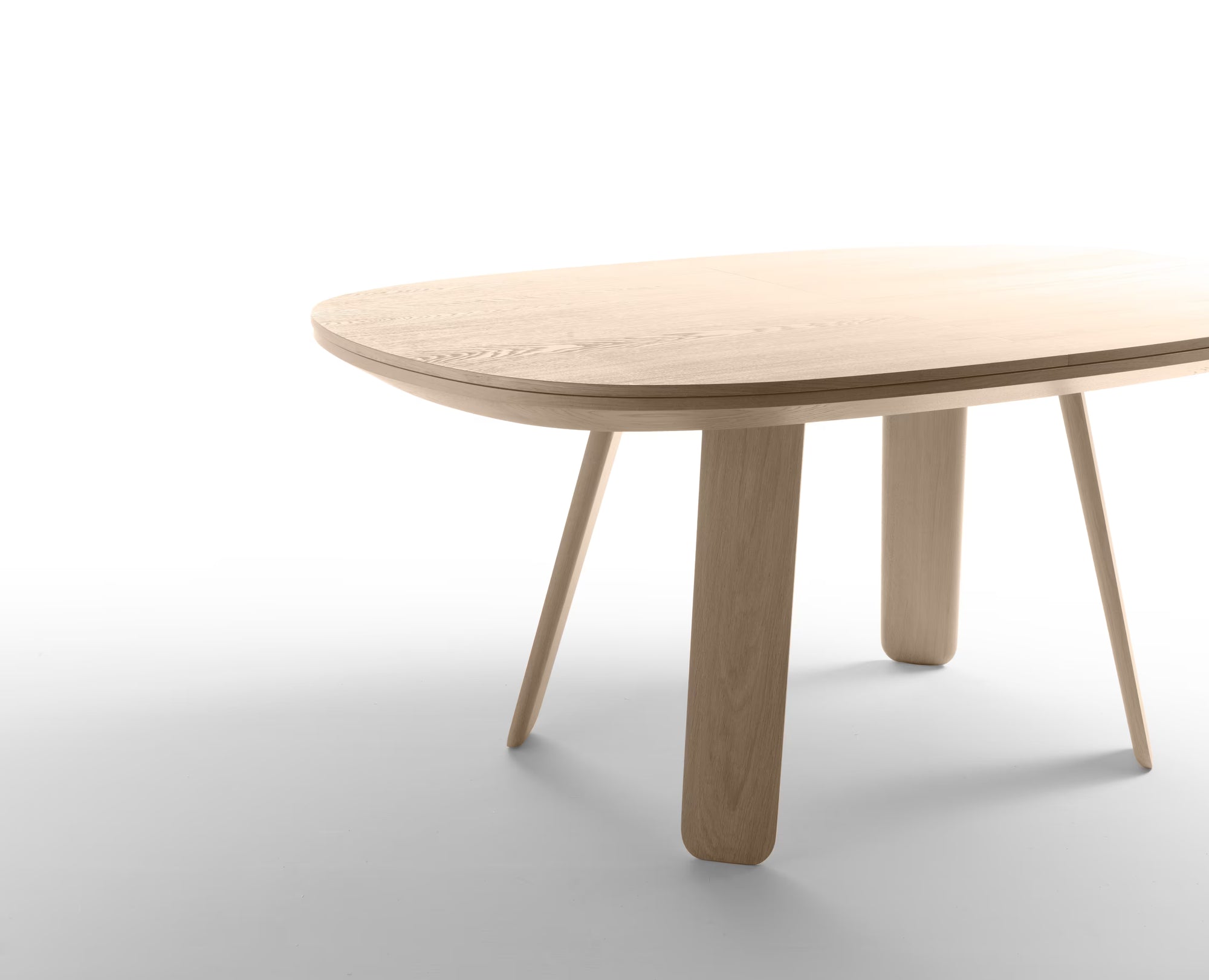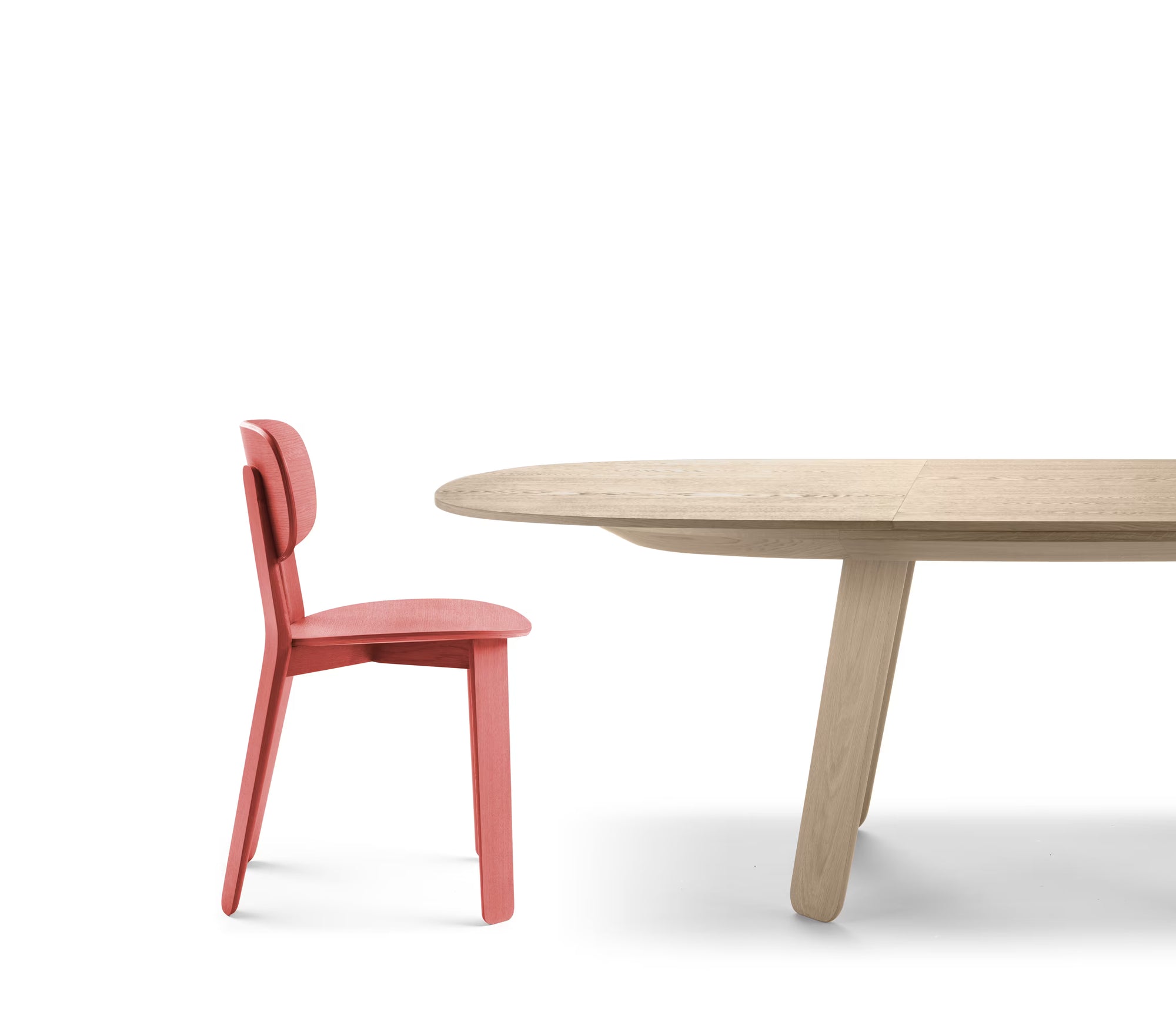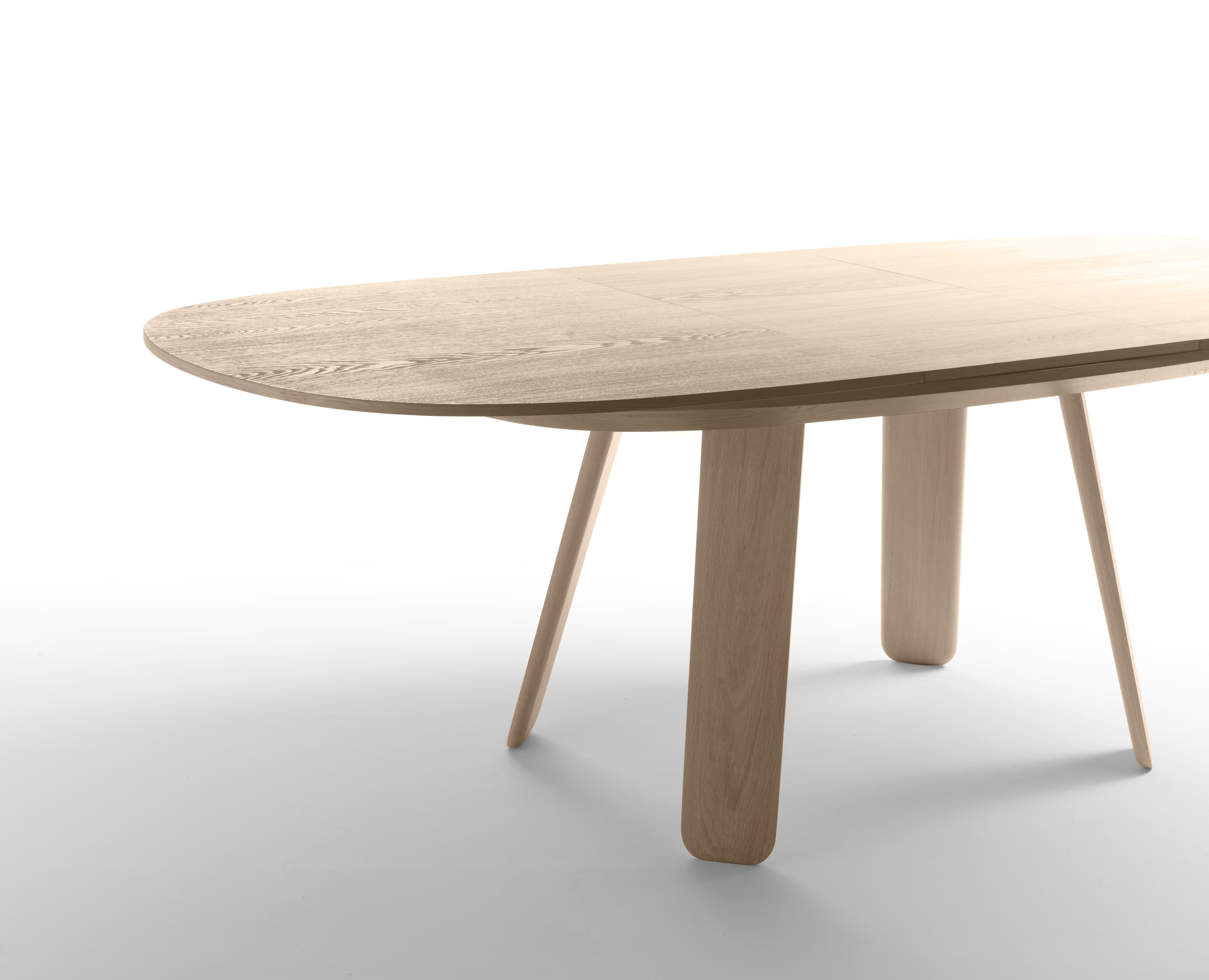 Ajouter des places sans changer l’implantation : Triku, table ovale en chêne, version fixe ou avec extension.