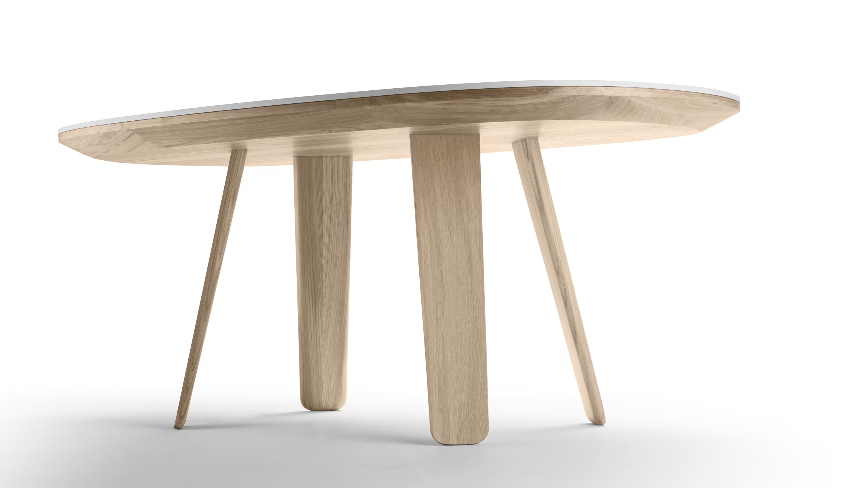 Plan continu en chêne sur structure et pieds en chêne massif : lecture claire, bords adoucis pour un contact sûr et un entretien simple au quotidien.
