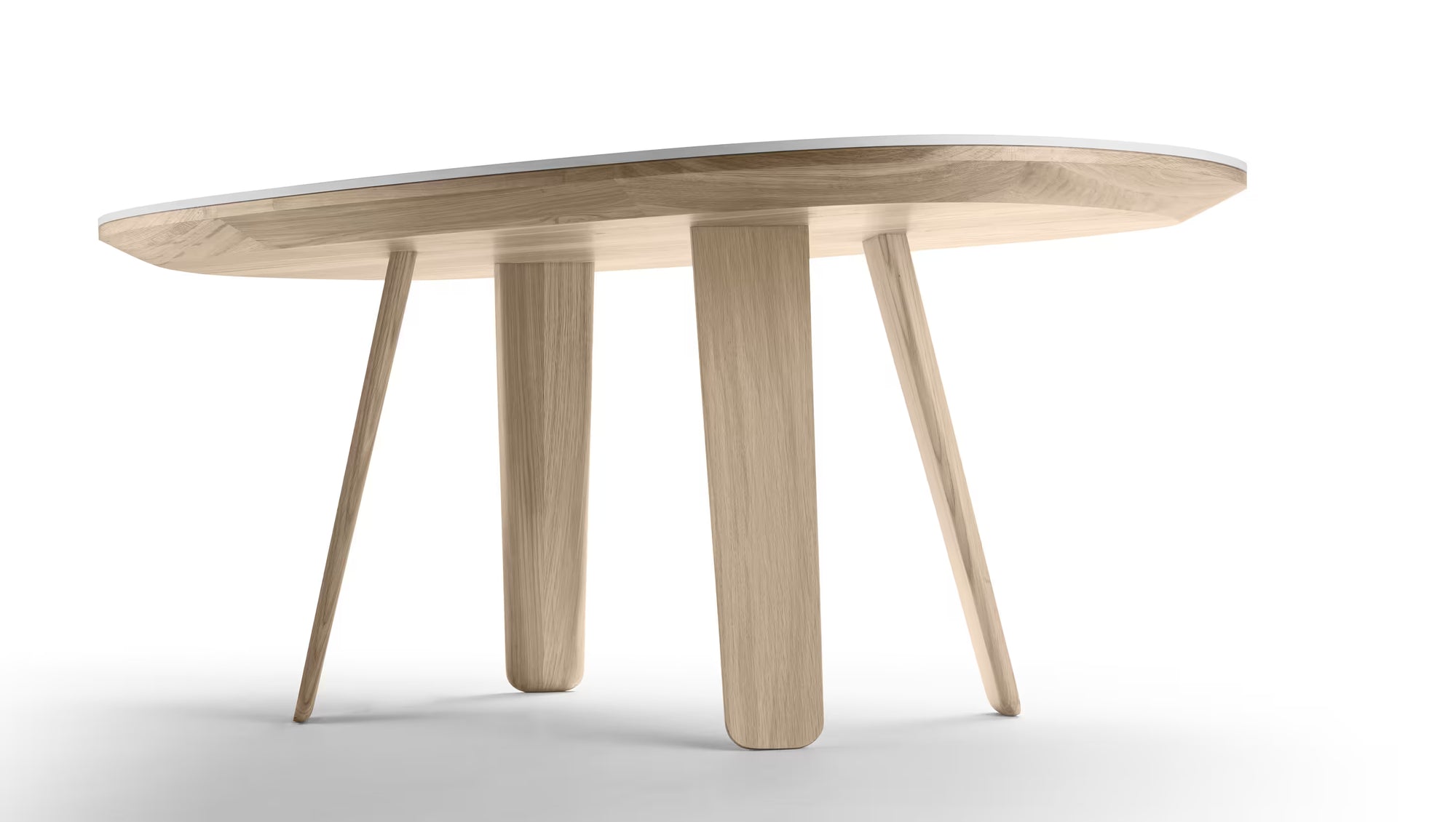 Plateau continu en chêne sur piètement en chêne massif ; plan lisible, bords adoucis pour un contact sûr et nettoyage simple. Le format ovale favorise le face-à-face et préserve la circulation autour de la table. La base est dégagée pour placer librement les assises et accéder facilement tout autour, en salle de réunion comme en restauration.