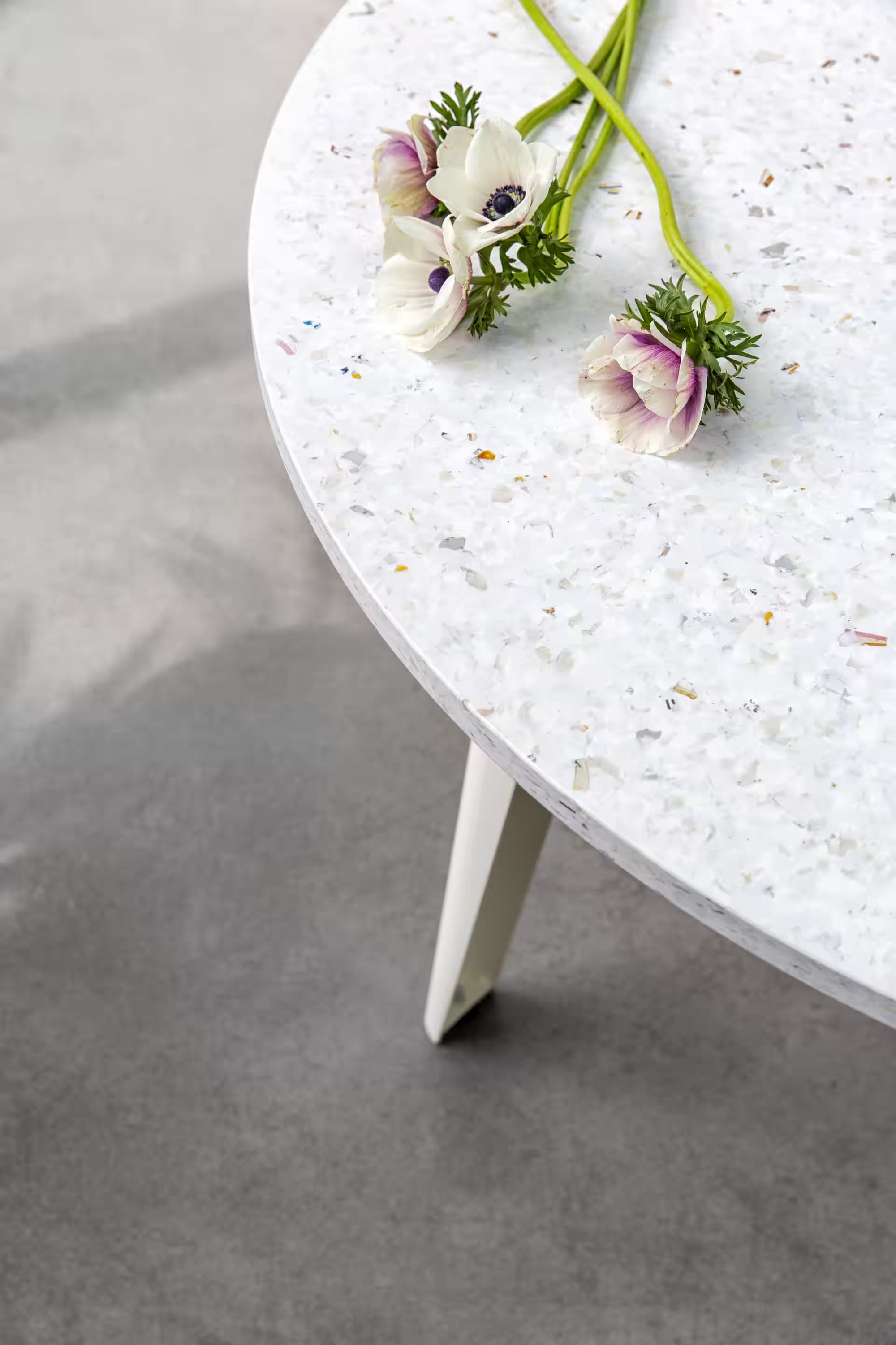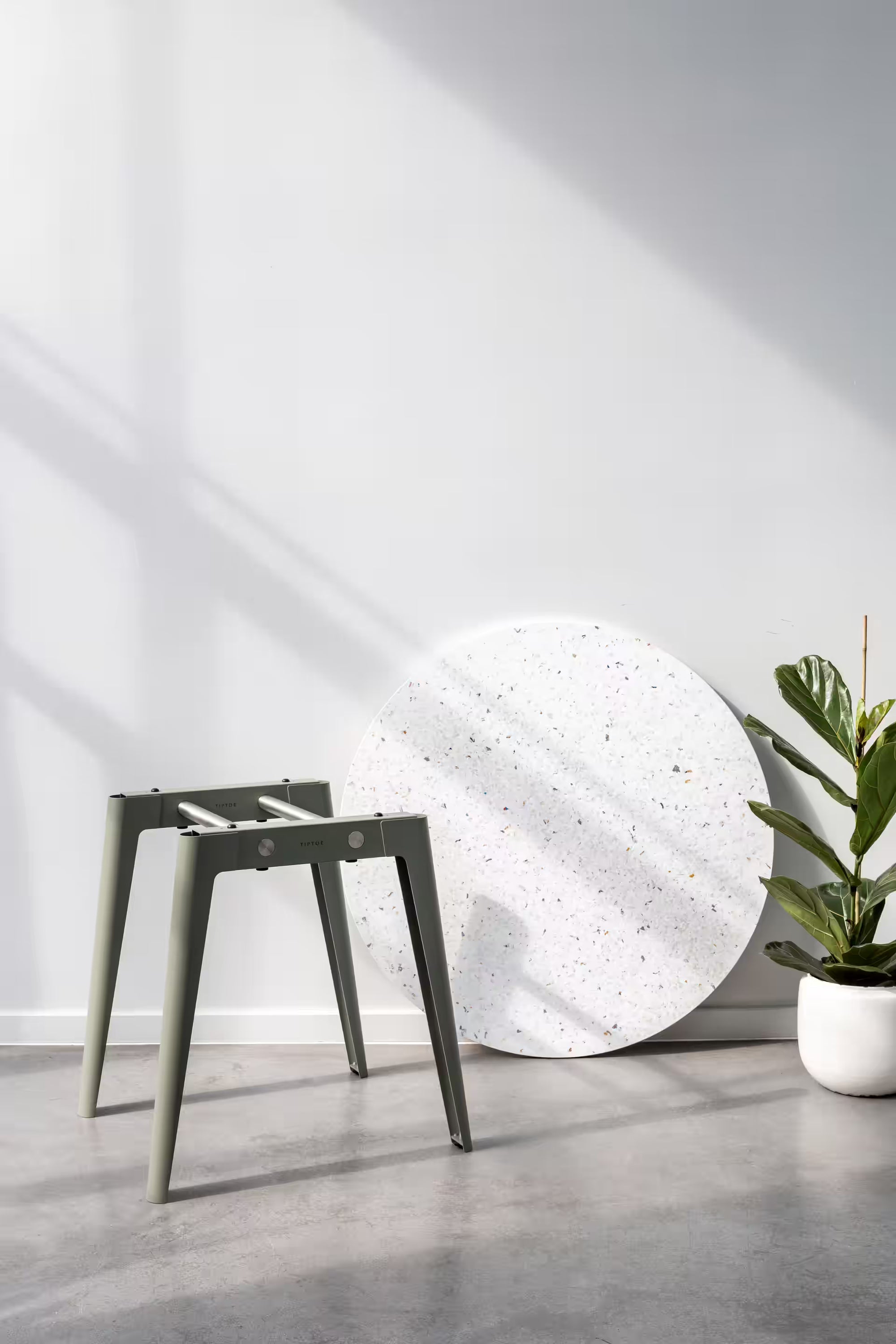 Le choix d’une matière recyclée pour le plateau et d’un acier recyclable pour la structure permet de concilier esthétique sobre, entretien simple et démarche responsable, dans un intérieur privé comme dans un lieu recevant du public.