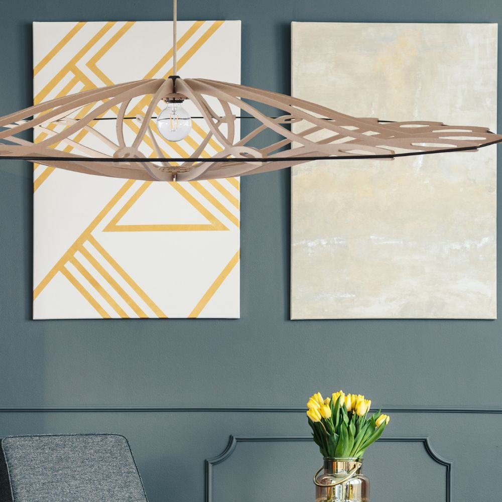 La suspension Twist fascine par son design minimaliste et fluide, où chaque courbe en bois joue avec la lumière. Ses dimensions généreuses, allant de 104 cm à 190 cm, apportent un effet sculptural à votre espace, sans jamais l’alourdir. Malgré sa grande taille, Twist se distingue par sa finesse et sa légèreté visuelle, idéale pour sublimer de vastes pièces tout en s’intégrant harmonieusement dans des intérieurs avec des plafonds bas. Éteinte, elle devient une œuvre d’art suspendue ; allumée, elle transforme la lumière en un jeu captivant de reflets et d'ombres, créant une ambiance à la fois moderne et apaisante.
